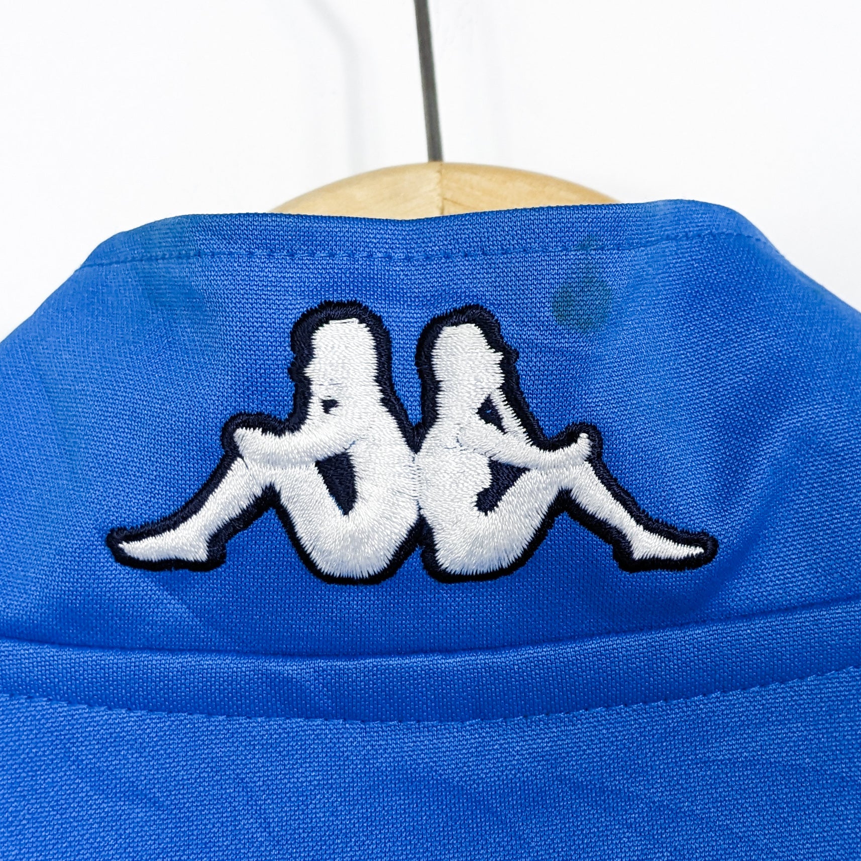 - Detail: minor stain and loose stitches